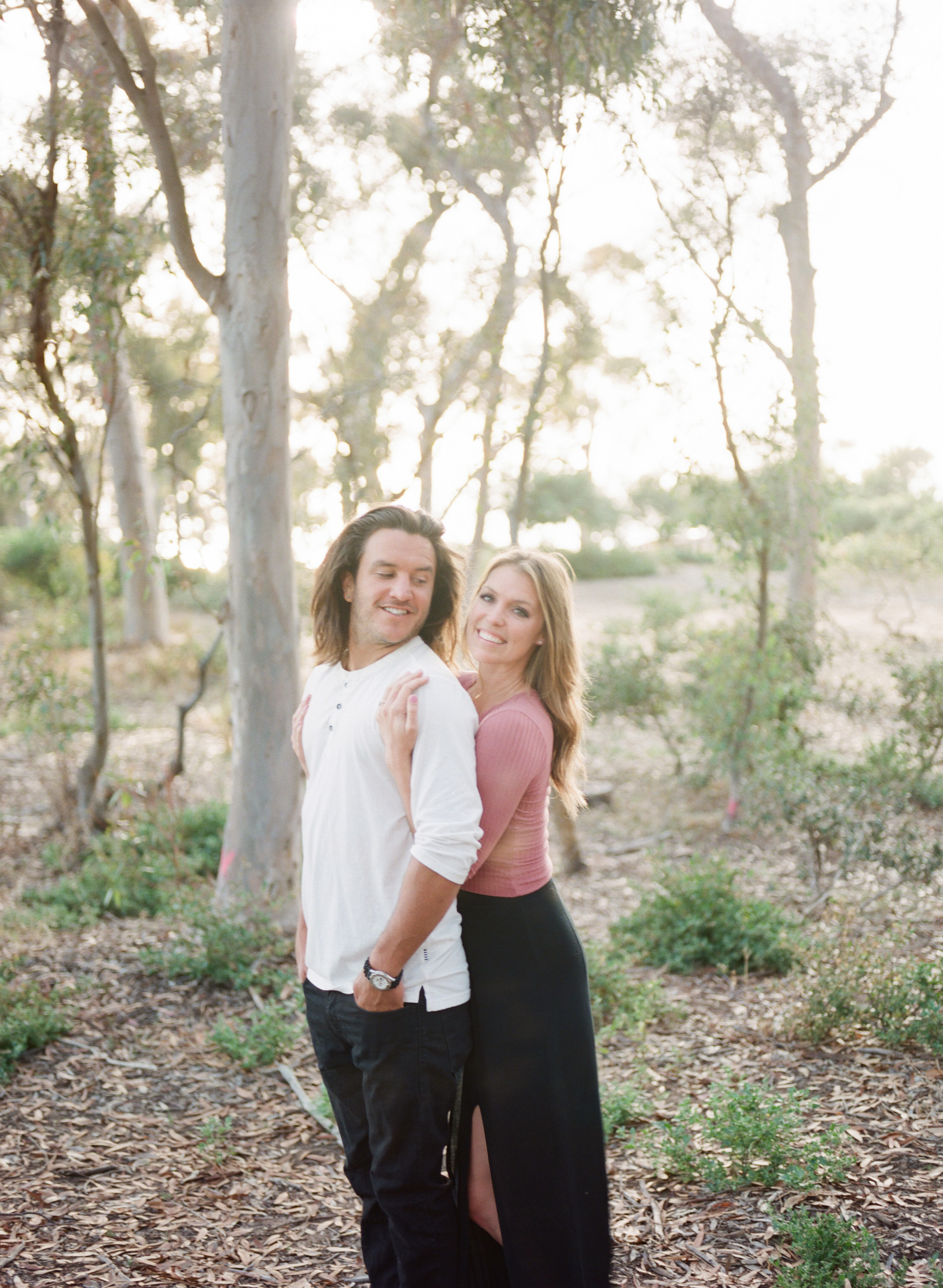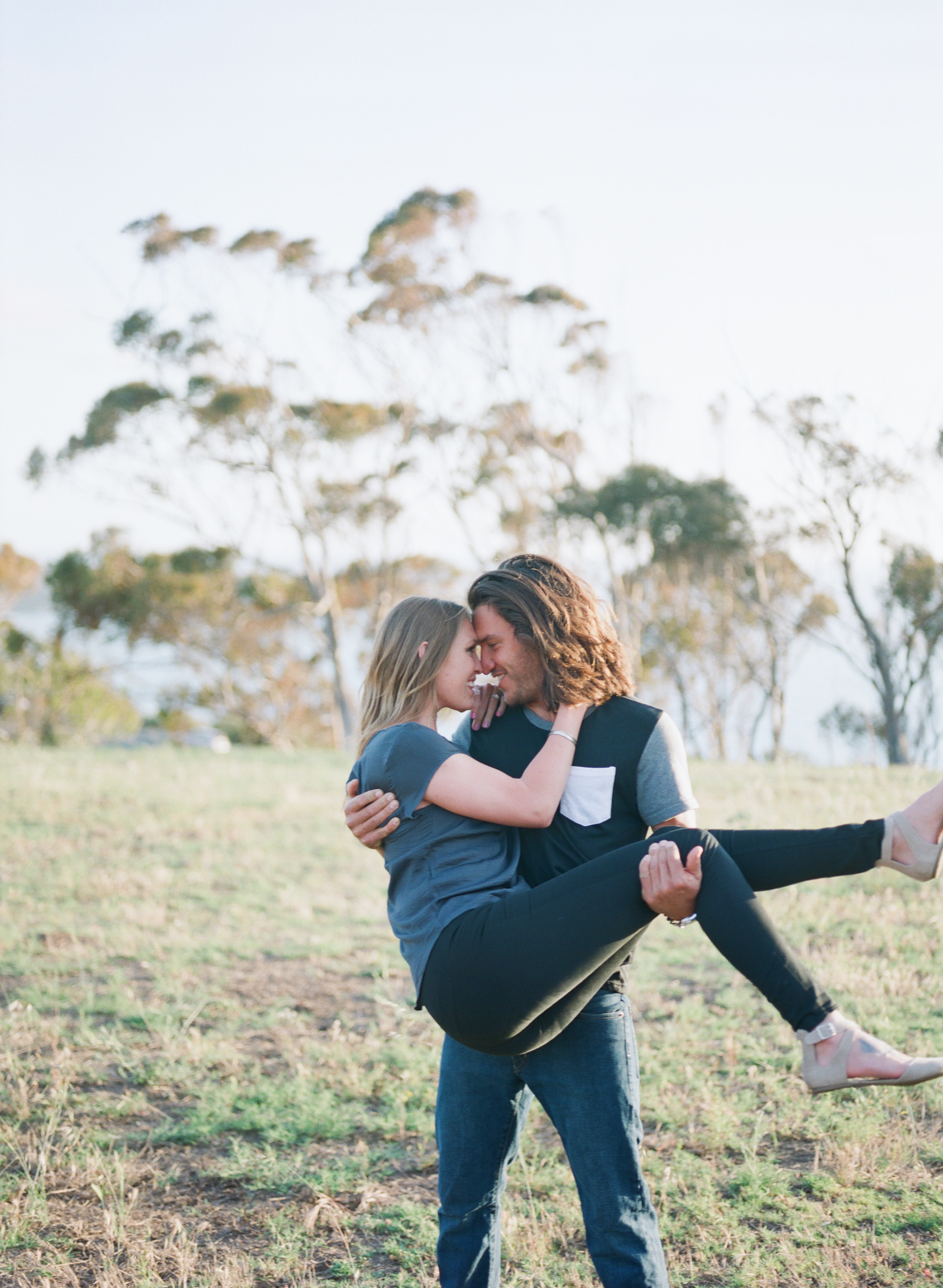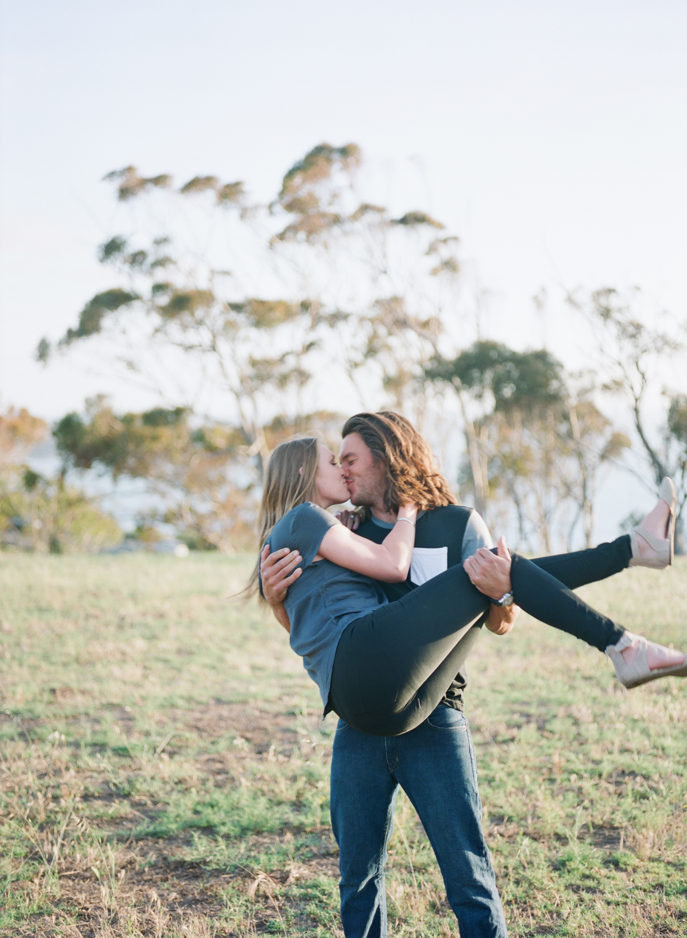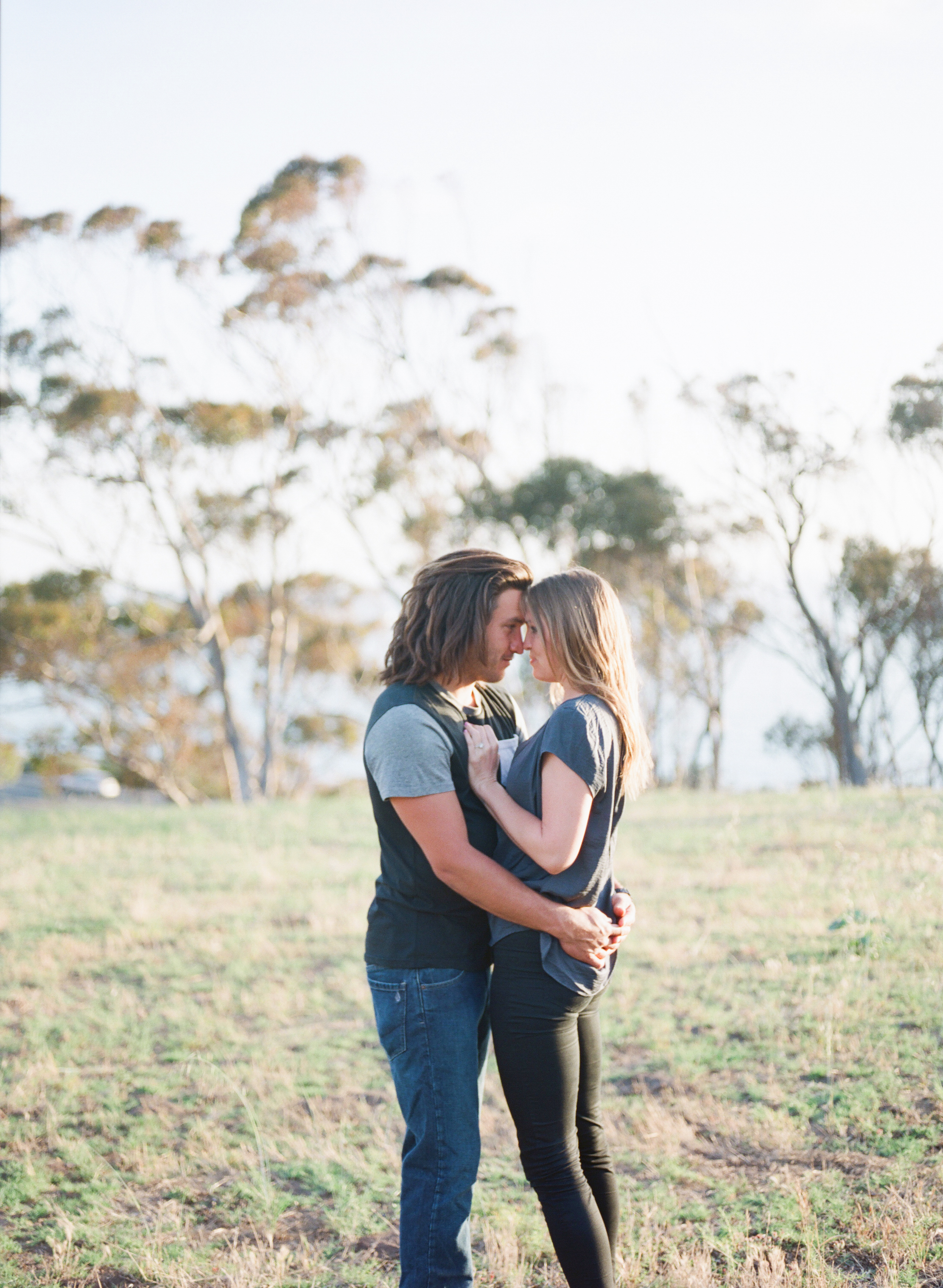 When we were originally supposed to do Katie and Brian’s engagement session, the weather decided not to be cooperative, and we got rained out! So we rescheduled for 2 weeks later, and I am so glad we did. We had the perfect setting. It was sunny and beautiful in La Jolla! Katie had told me about how Brian proposed to her on the beach, their wedding was going to be on the beach… but she didn’t want the engagement photos on the beach. So, we went up to a cliff, above Scripps Pier, and found a little forest and field. It was perfect.